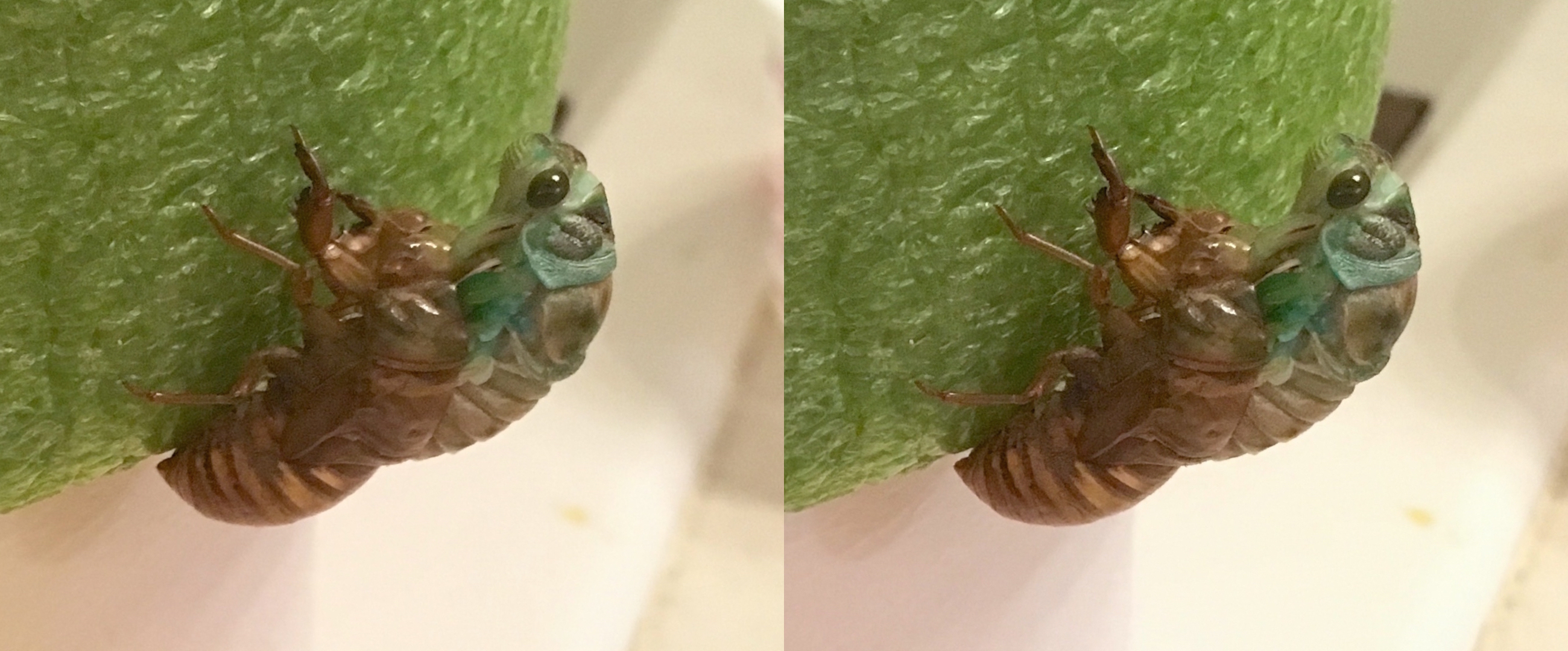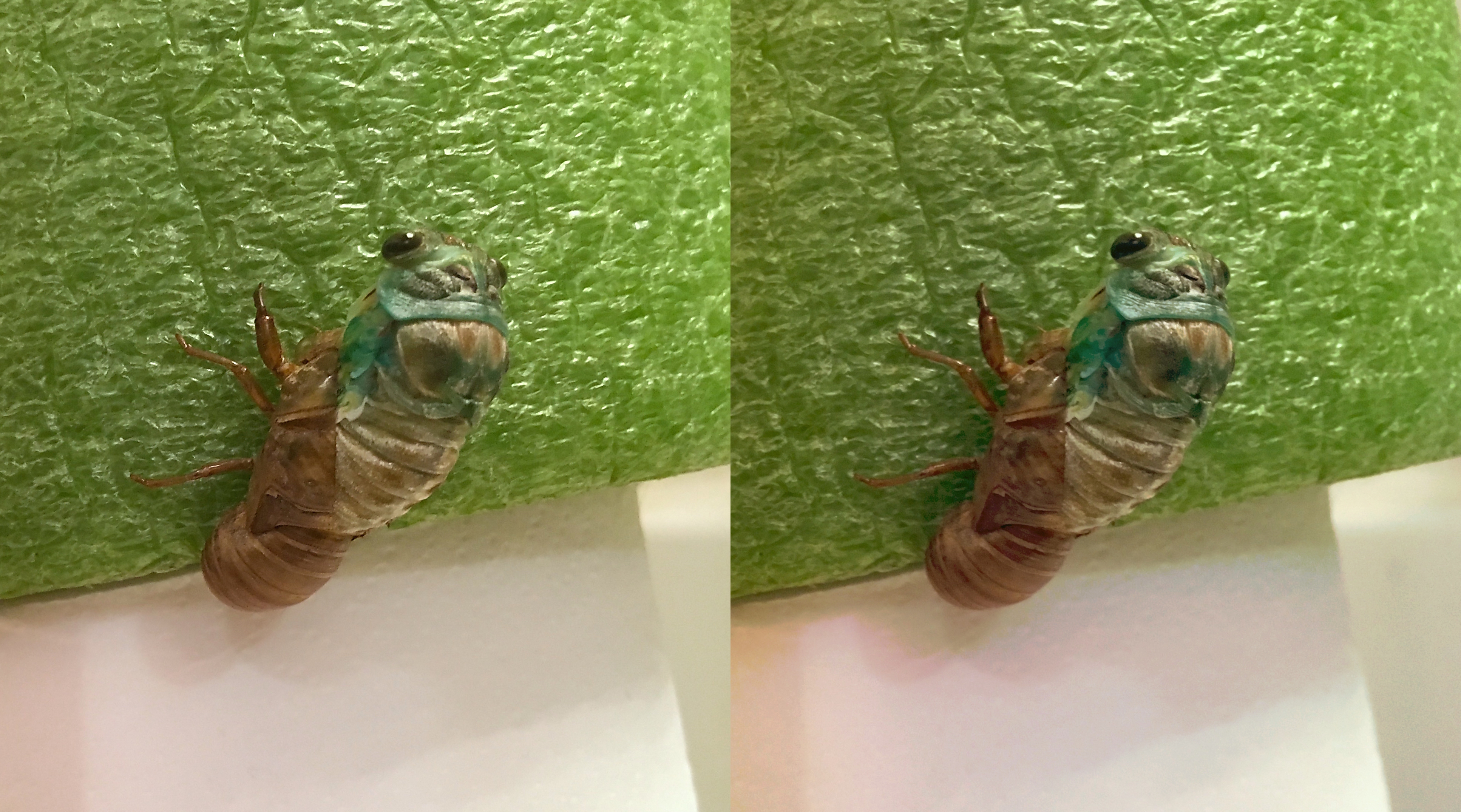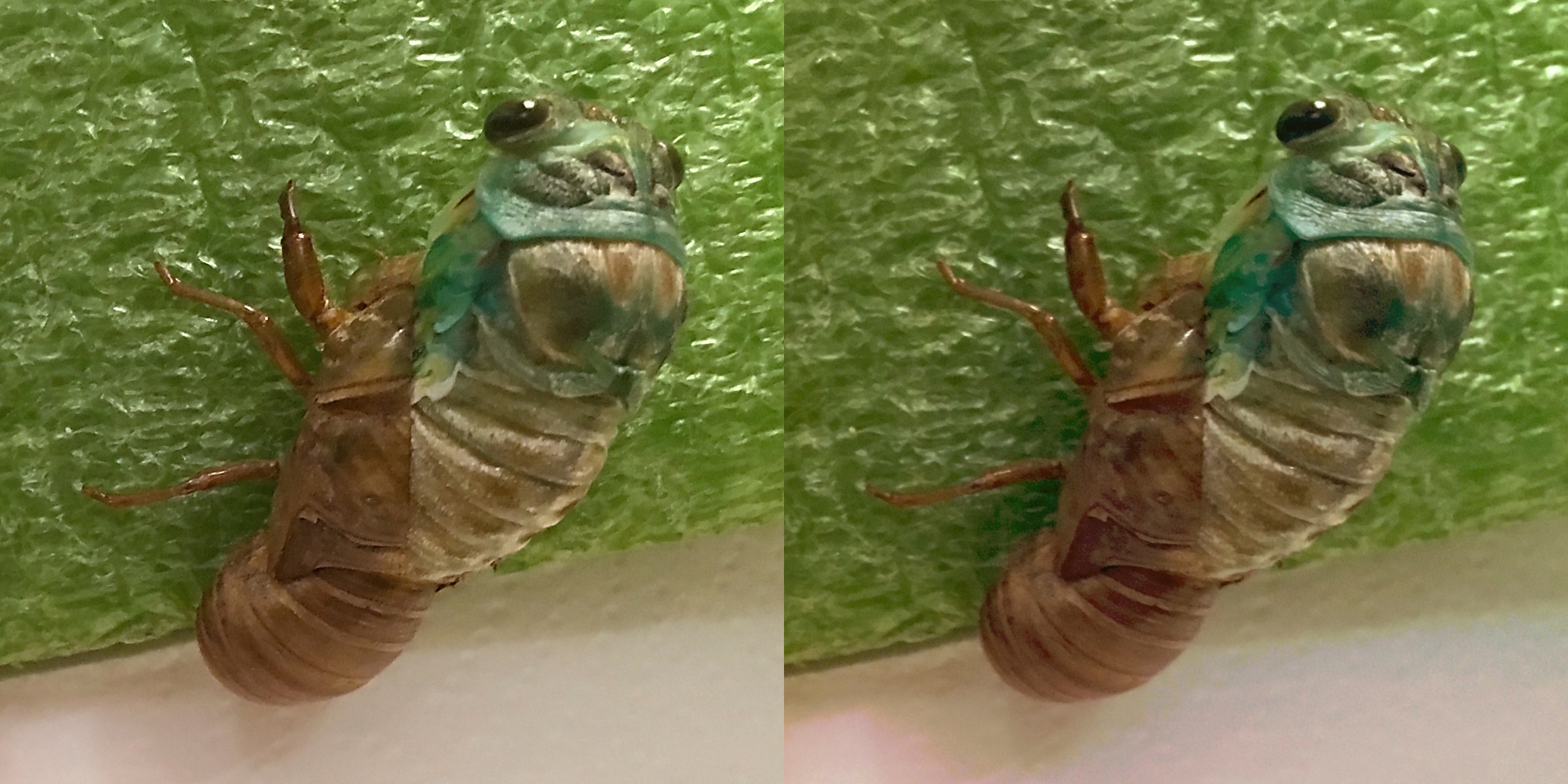 The next marker in her eclosion (emergence) will be the freeing of her forelegs and wings—the latter seen here curled and compacted up, very green, at her sides. (To be continued…)