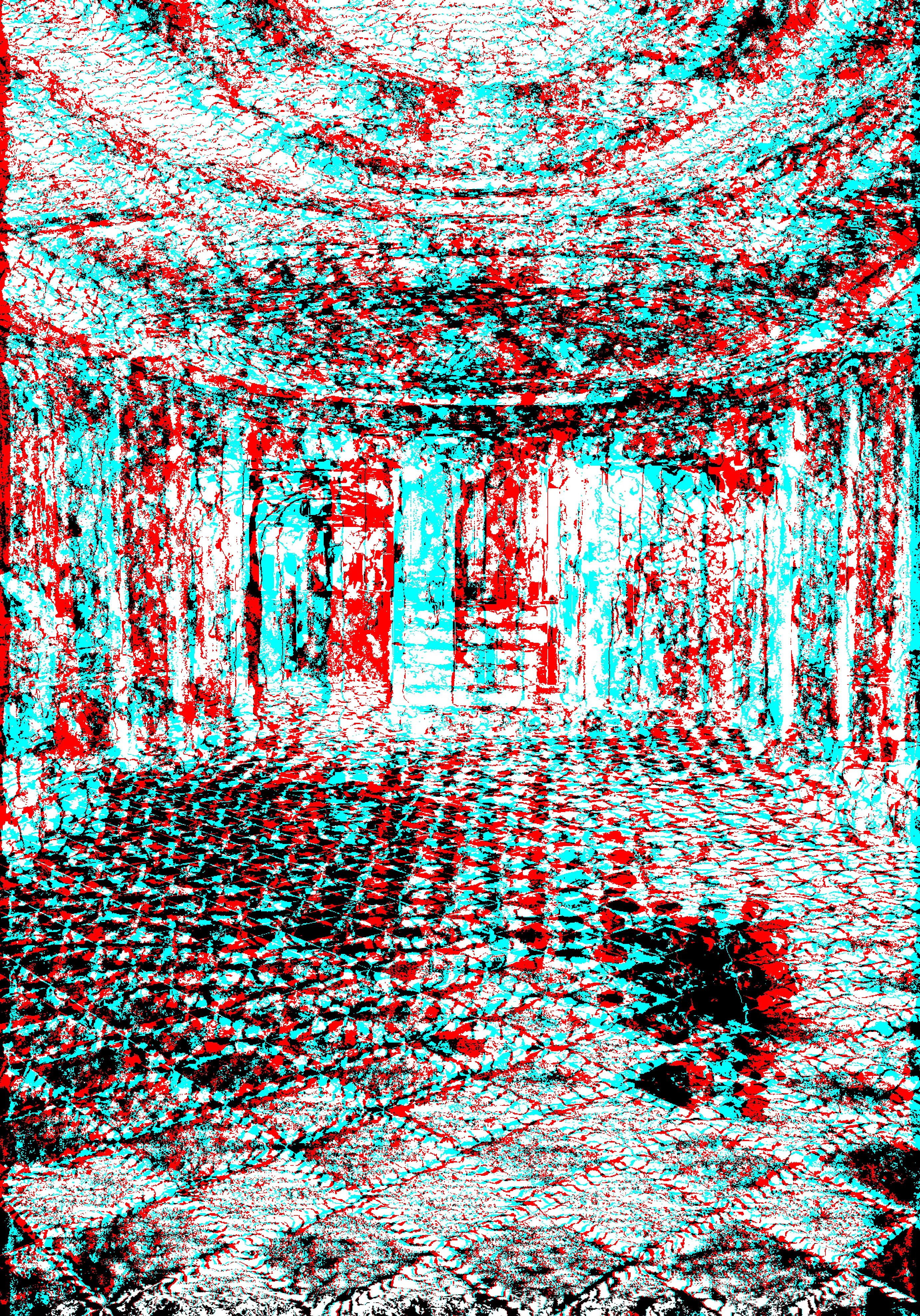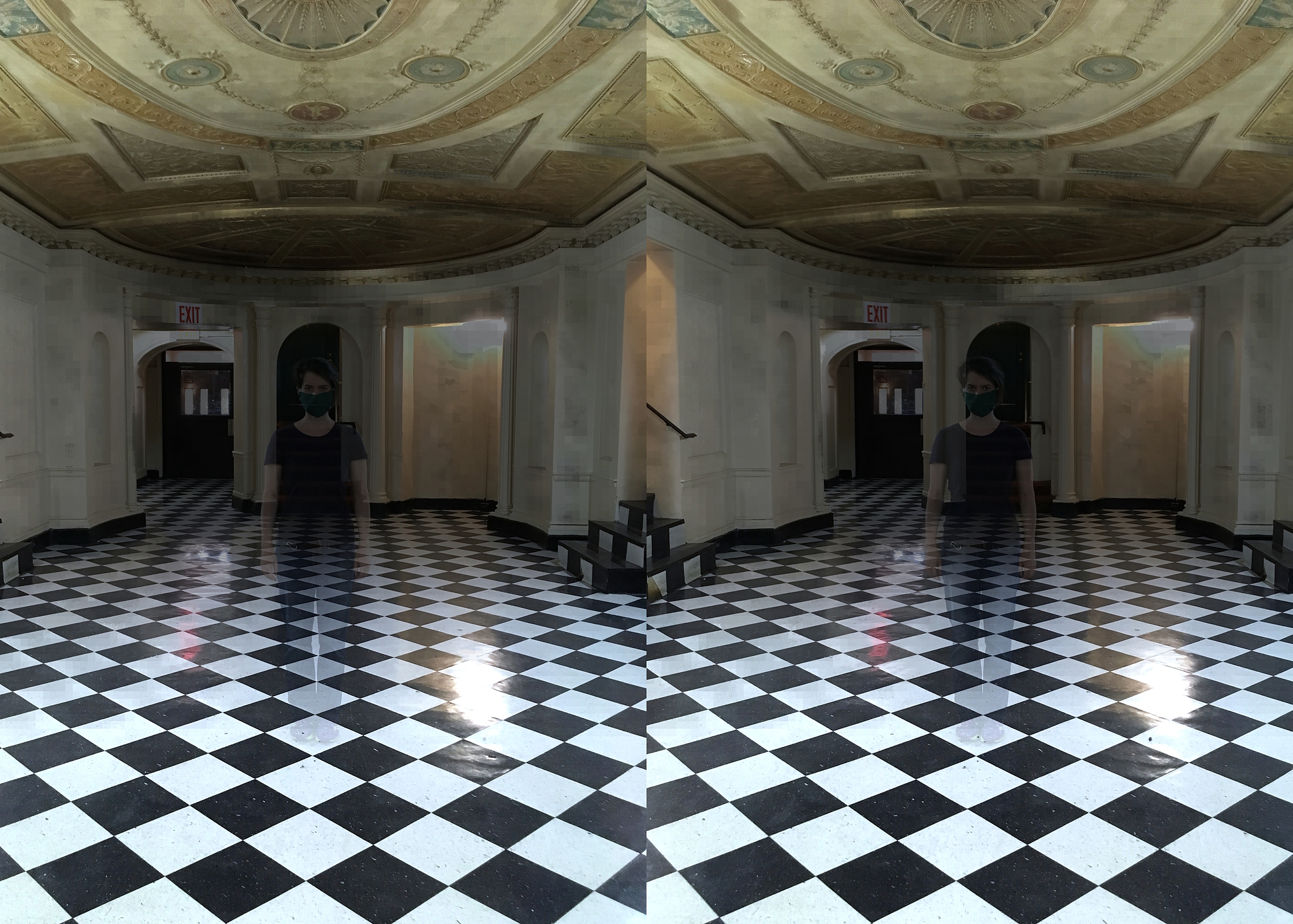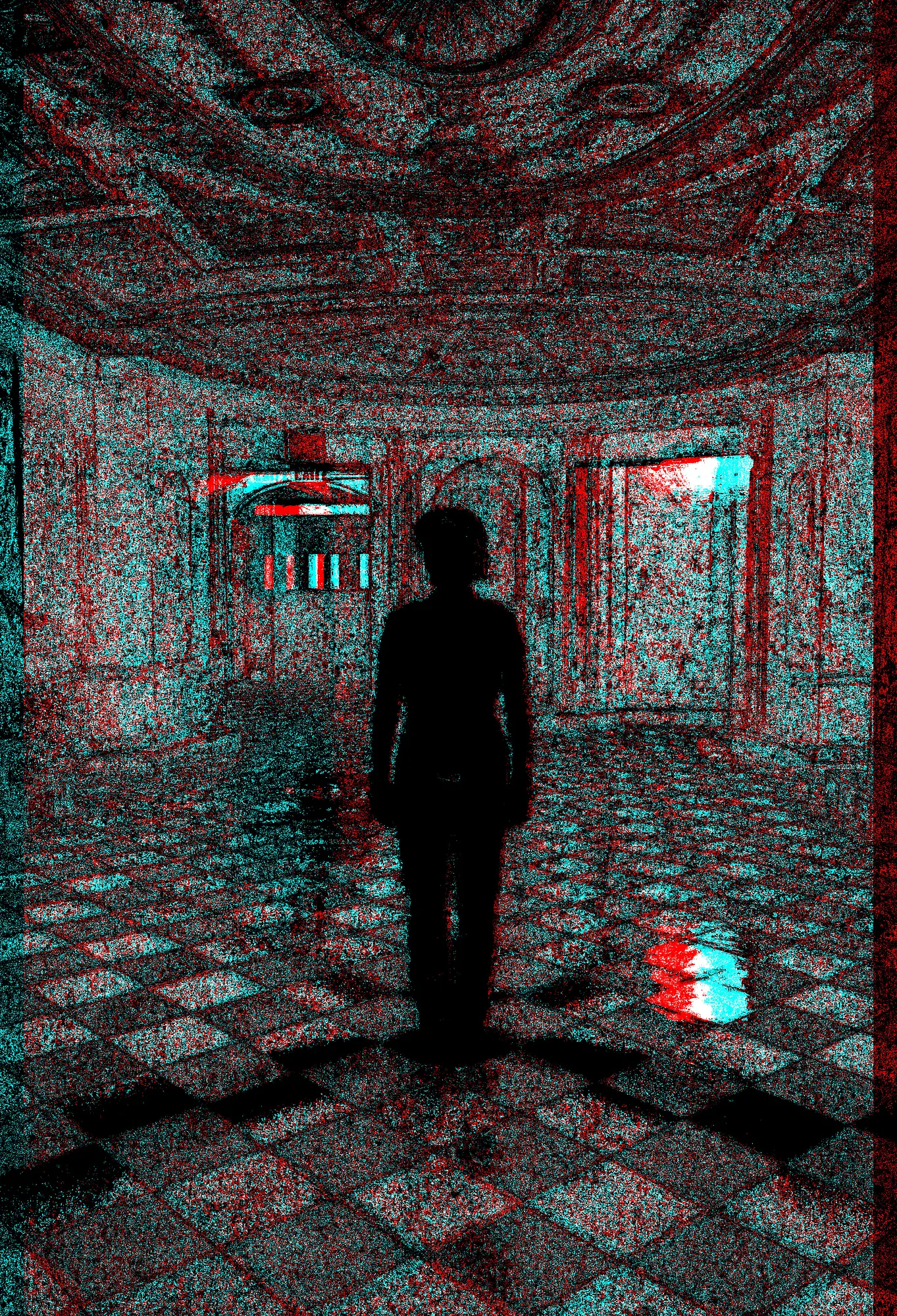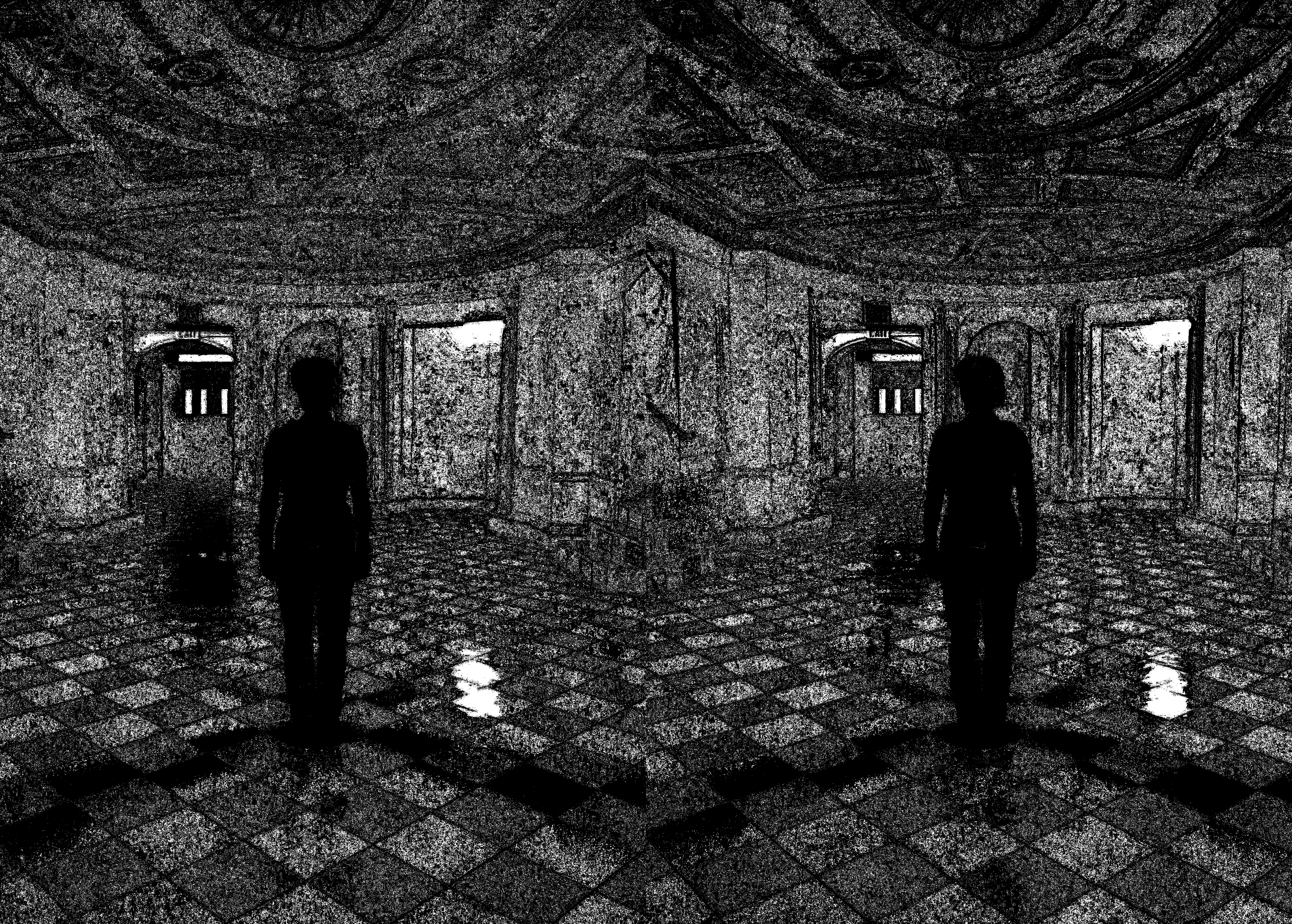 About the 2nd picture: all organic matter on Earth emits faint radiation, due to the naturally-occuring radioisotope Carbon-14. In this stereo-radiometer image of the lobby, you can see the C14 radiation emitted from the wood of the walls and ceiling, as well as the floor, which may be made from carbon-containing stone, or painted with a carbon-containing compound. But not that ghastly figure: not a trace of Earthly matter in it. It even sucks up all the natural radiation like a black hole…