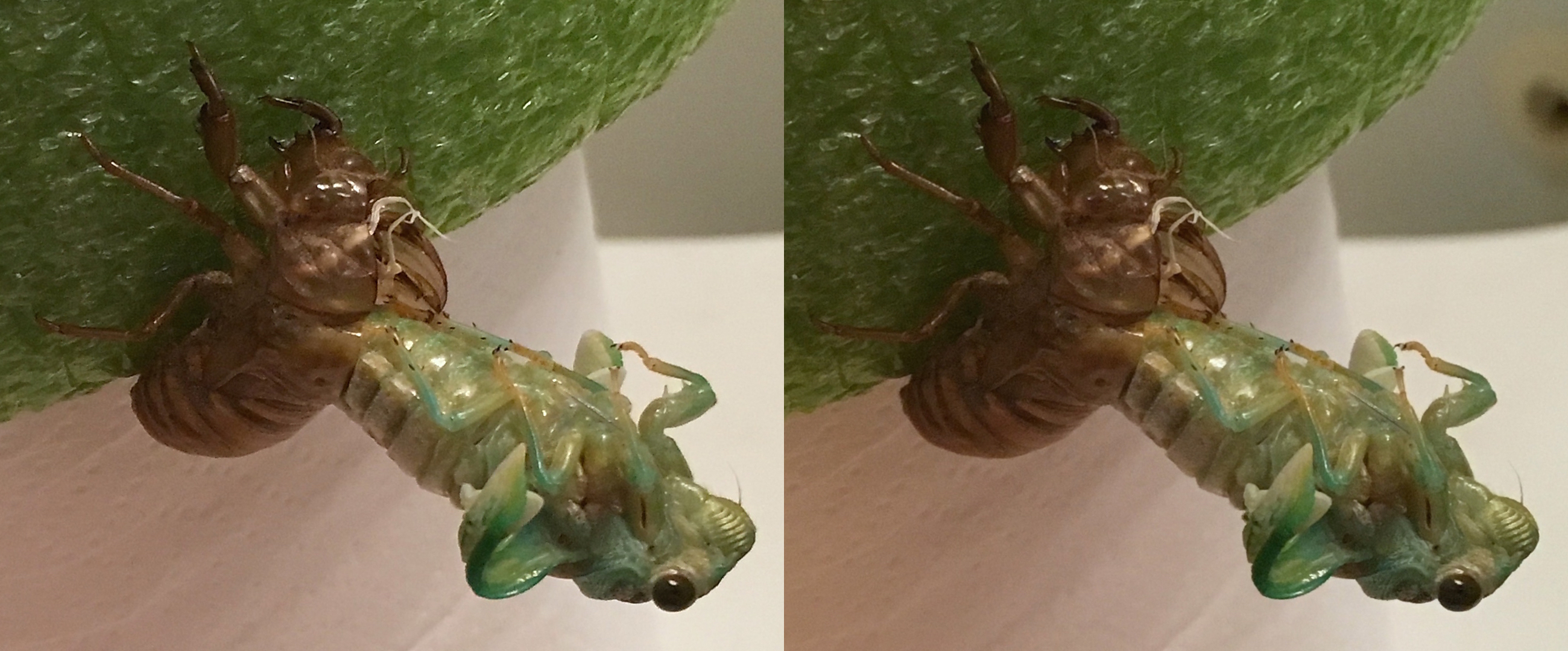 Well into her ‘practicing backflips’ stage, Betsy the Cicada has now freed her hindlegs, which, as can be seen in these zoom-in stereovideos, have teeny-tiny spines on them. These are so small I didn’t notice them in person! Based on hindleg spines in other species, these are probably to help Betsy jump—useful not only for merely jumping, but also to get a headstart when flying.