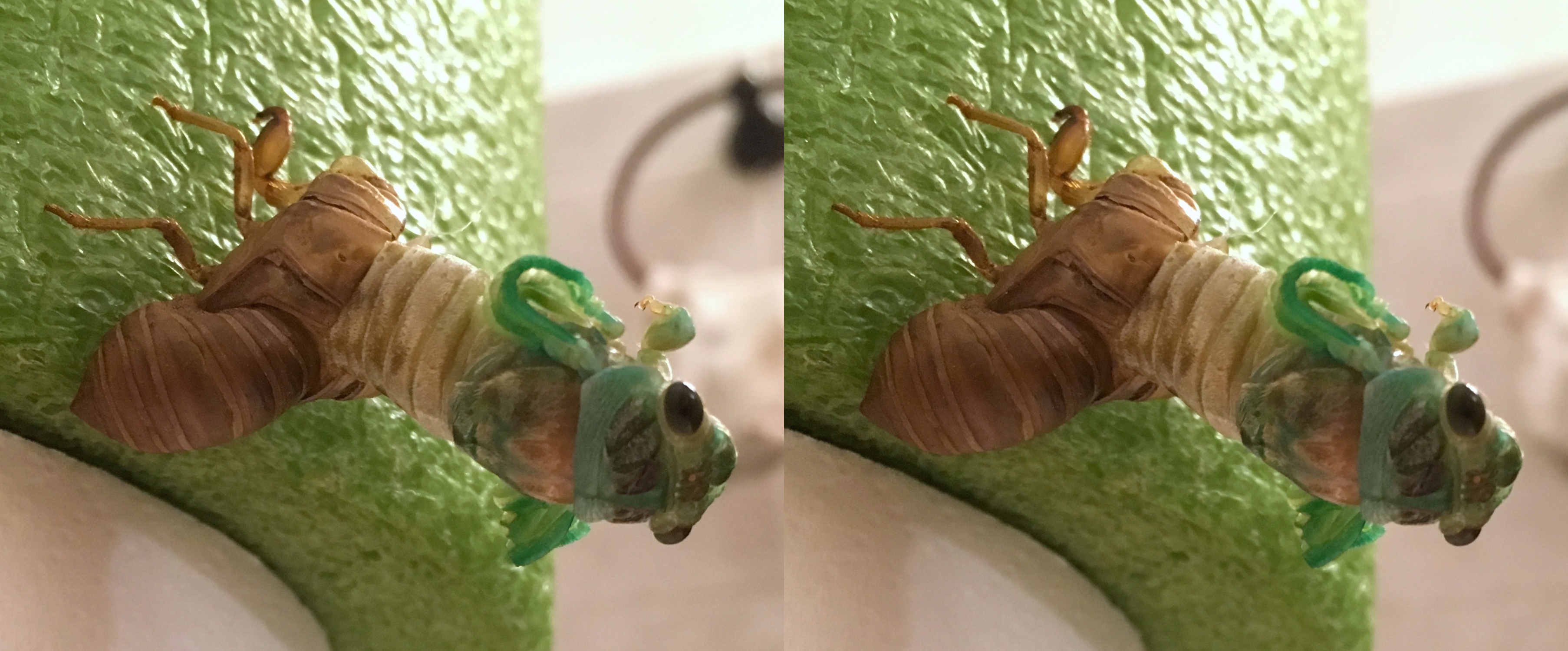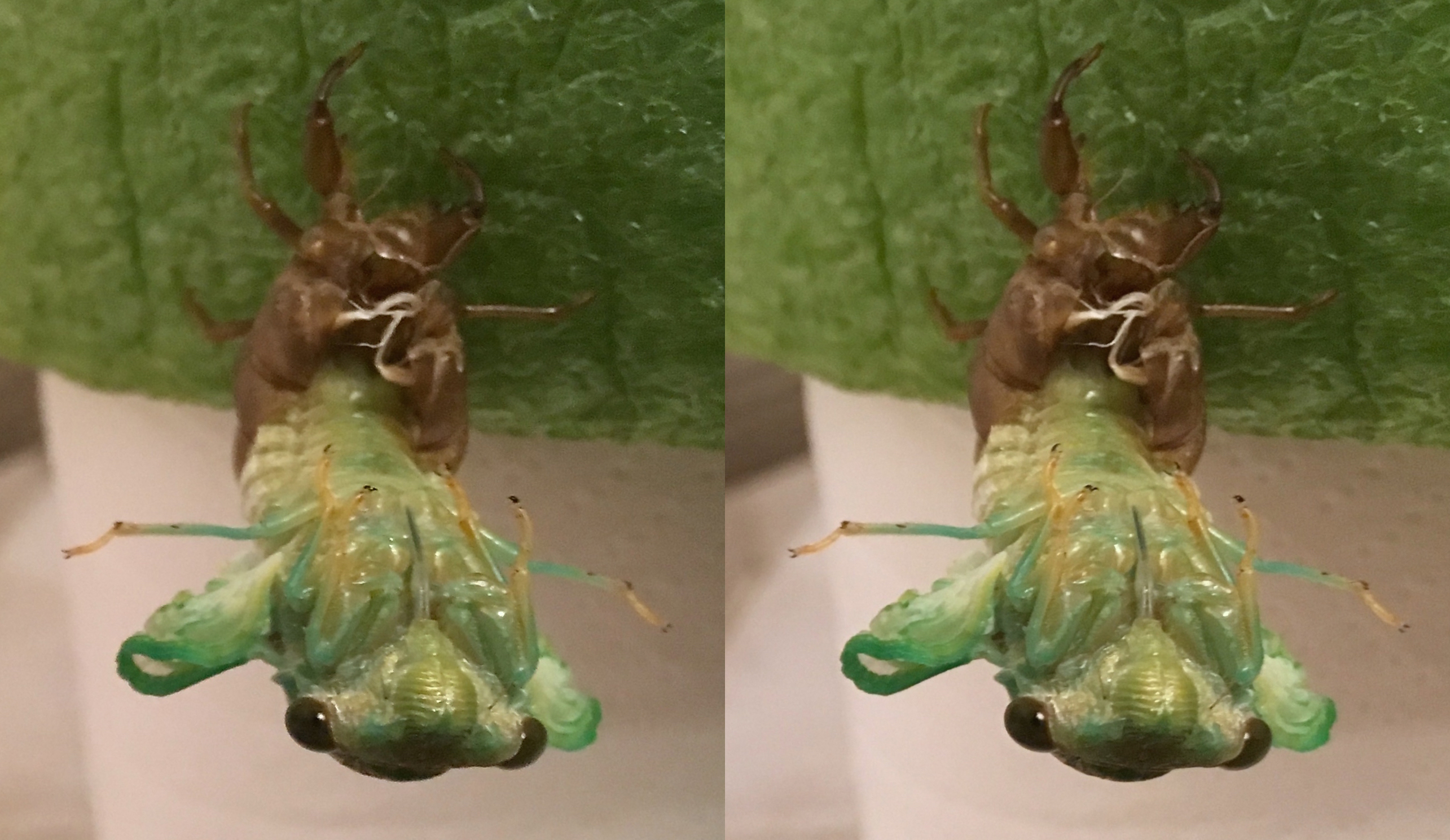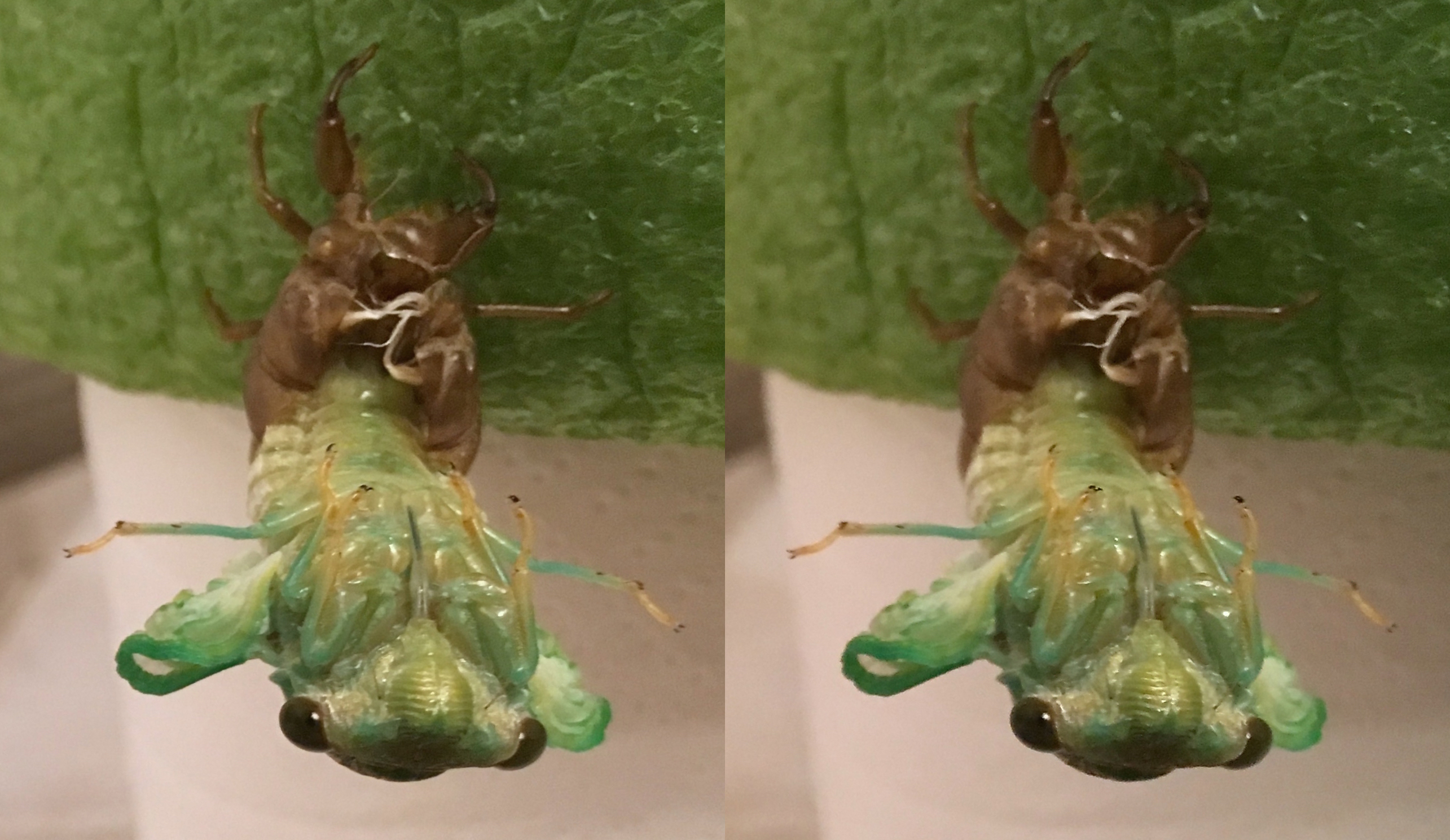 Betsy the Cicada! 30 minutes into ecdysis (molting), I think this is the ‘baby dragon,’ or possibly ‘airplane’ stage. I imagine her softly saying wheeeeeeeee and/or making airplane whooshing sounds in this first pic. The second pic is actually 3 minutes earlier, before she stuck her hind legs out.