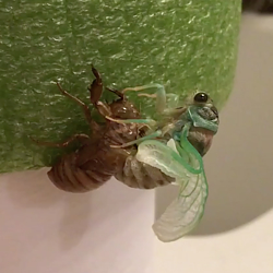 Here is Betsy the Cicada pulling herself completely free! Sorry these stereovideos arenβt well-stabilized (catadioptric with hand-held mirror); I recommend viewing the 2nd shot first, which is better-aligned. Both are from ~34 minutes into ecdysis (molting).