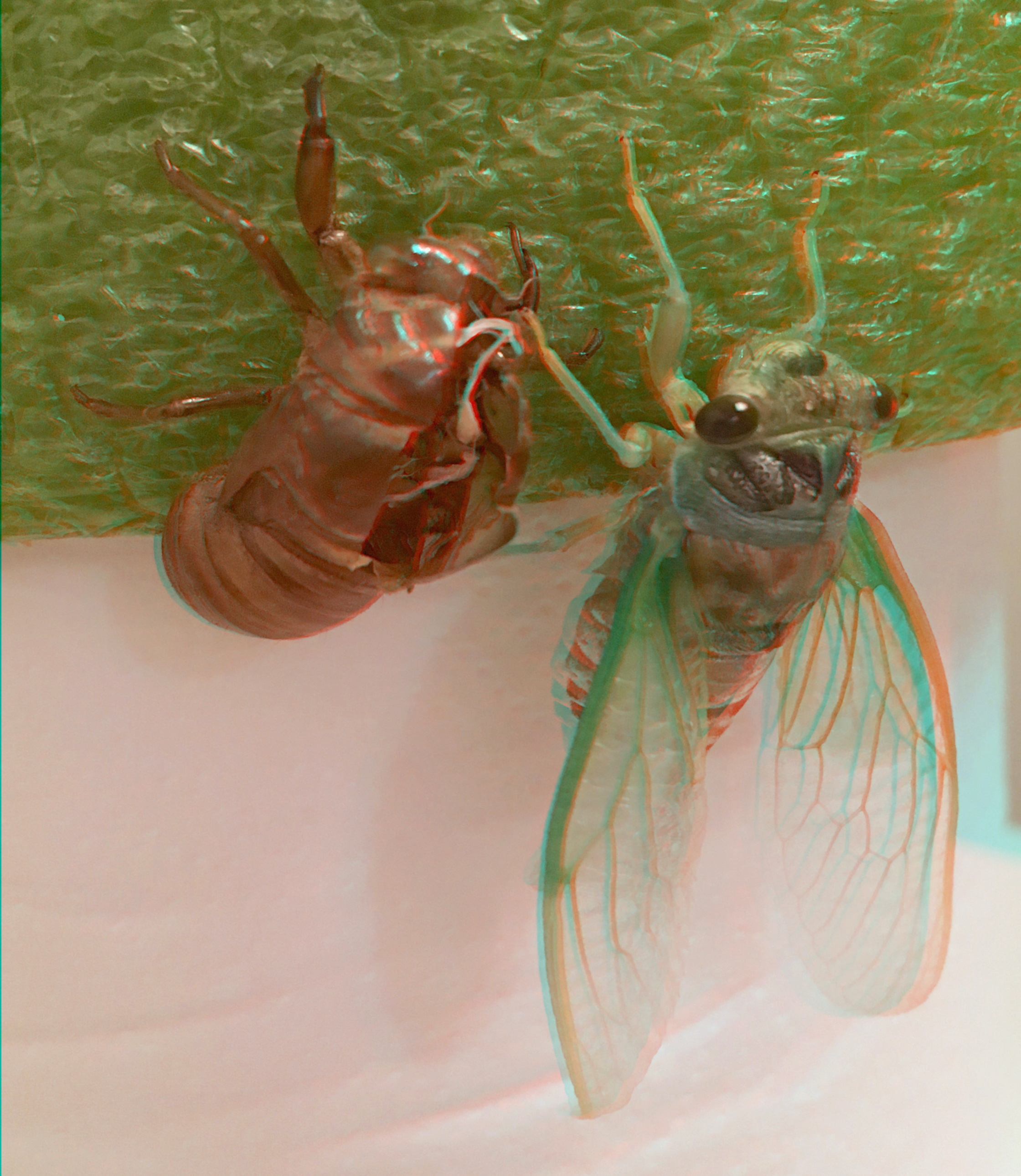 In total, the ecdysis (molting) took 34–35 minutes. At this point—36 minutes elapsed—it was 1 hour and 15 minutes after sunset. In the wild, Betsy would be hanging onto a tree branch in the dark, hopefully hiding beneath some leafy cover. (As in my previous posts, I think darkness, and specifically cover from moonlight, is one of the cues that tells the nymph to stop climbing and begin ecdysis.) I was glad that this sheltered environment guaranteed her safety for her dangerous first night as an adult.