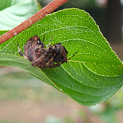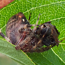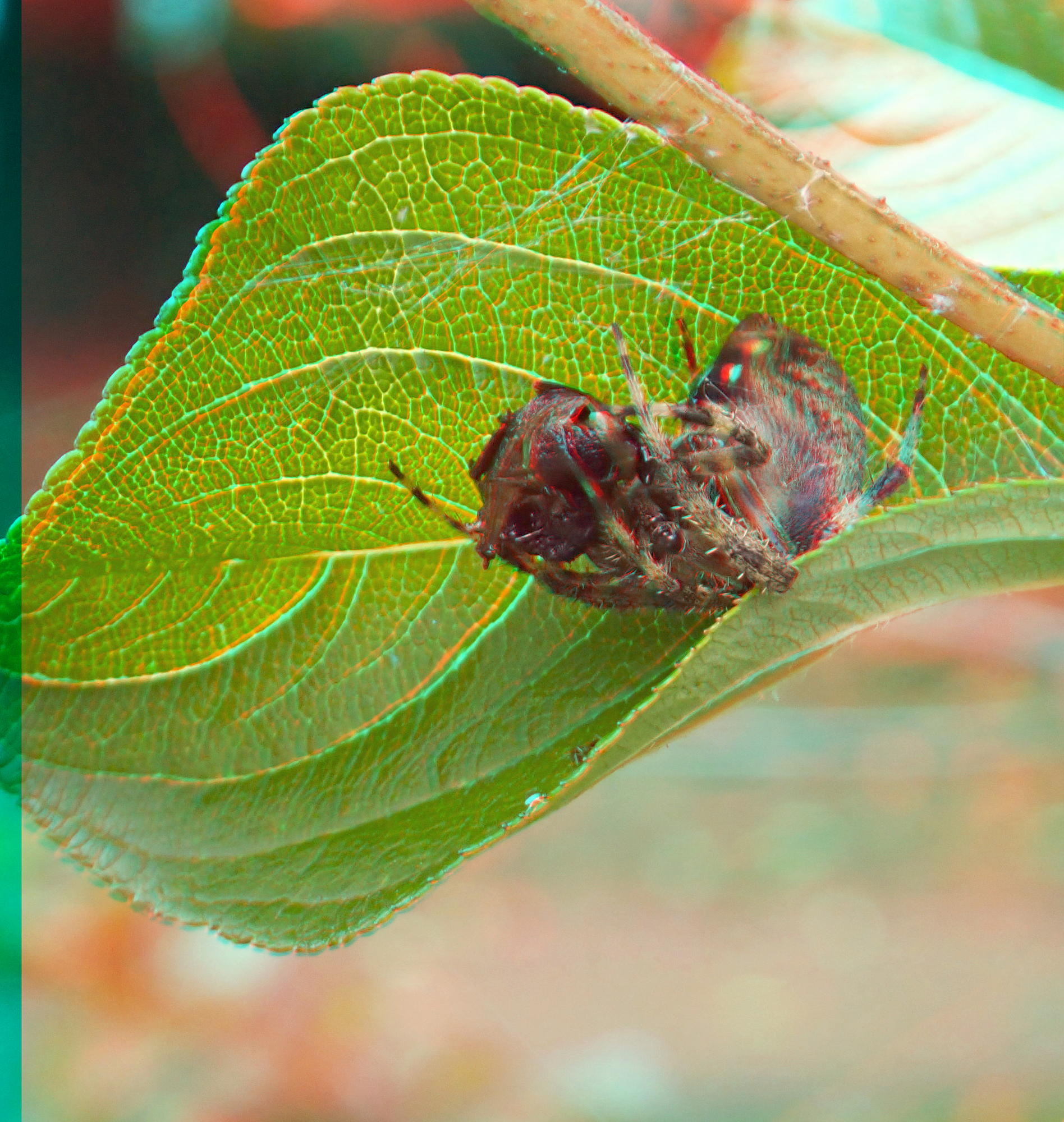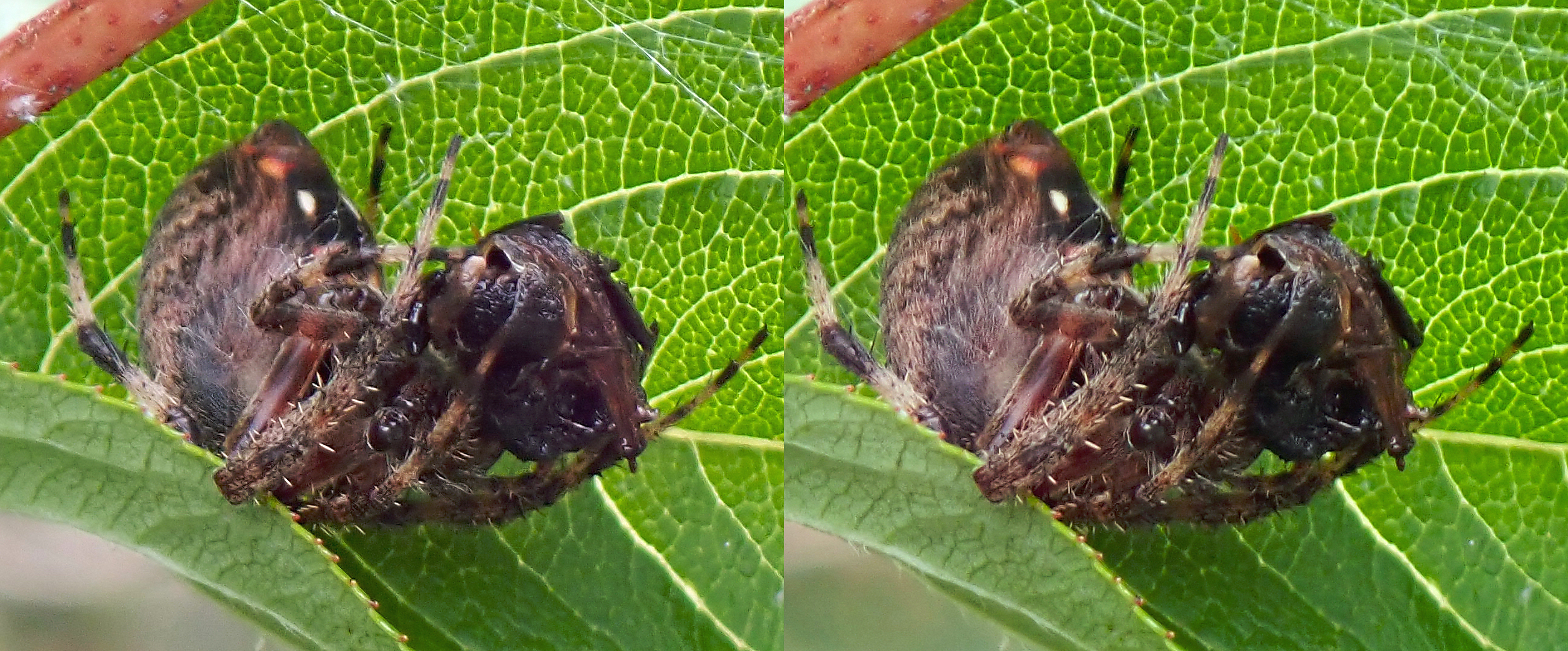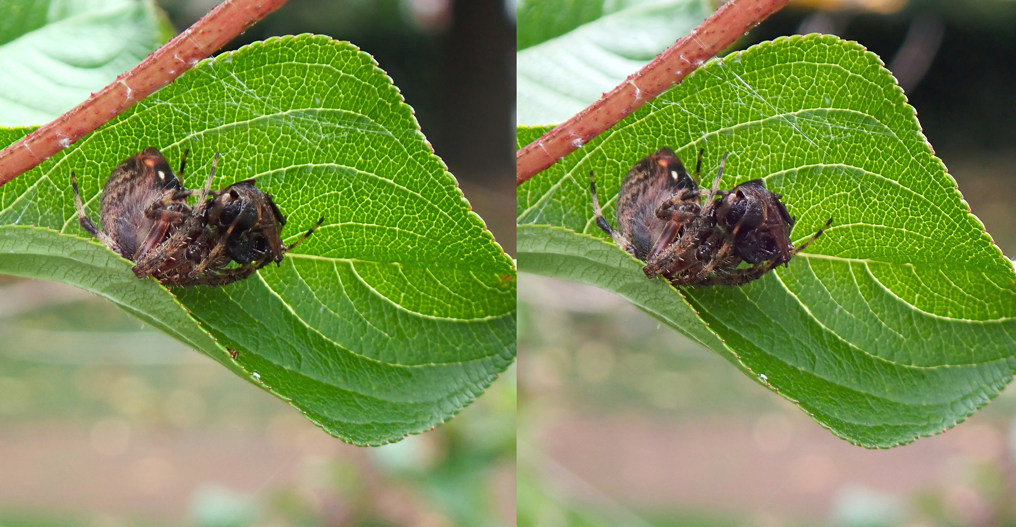 I spotted this big (~.75"/~1.5cm) spider on a beautiful web the other day, when it was windy and I didn’t have a mirror. On errands today, I passed by and found it not in the center of its web like before, but hidden away for a gruesome lunch time. Not sure what this lump of insect flesh on the menu is—perhaps a bumblebee cruelly crushed into a near-sphere—but I hope it didn’t suffer long. This stereo is a bit imperfect in terms of focus, wind, and the spider moving between shots. The anaglyph is flipped to feature the sharper of the original images.