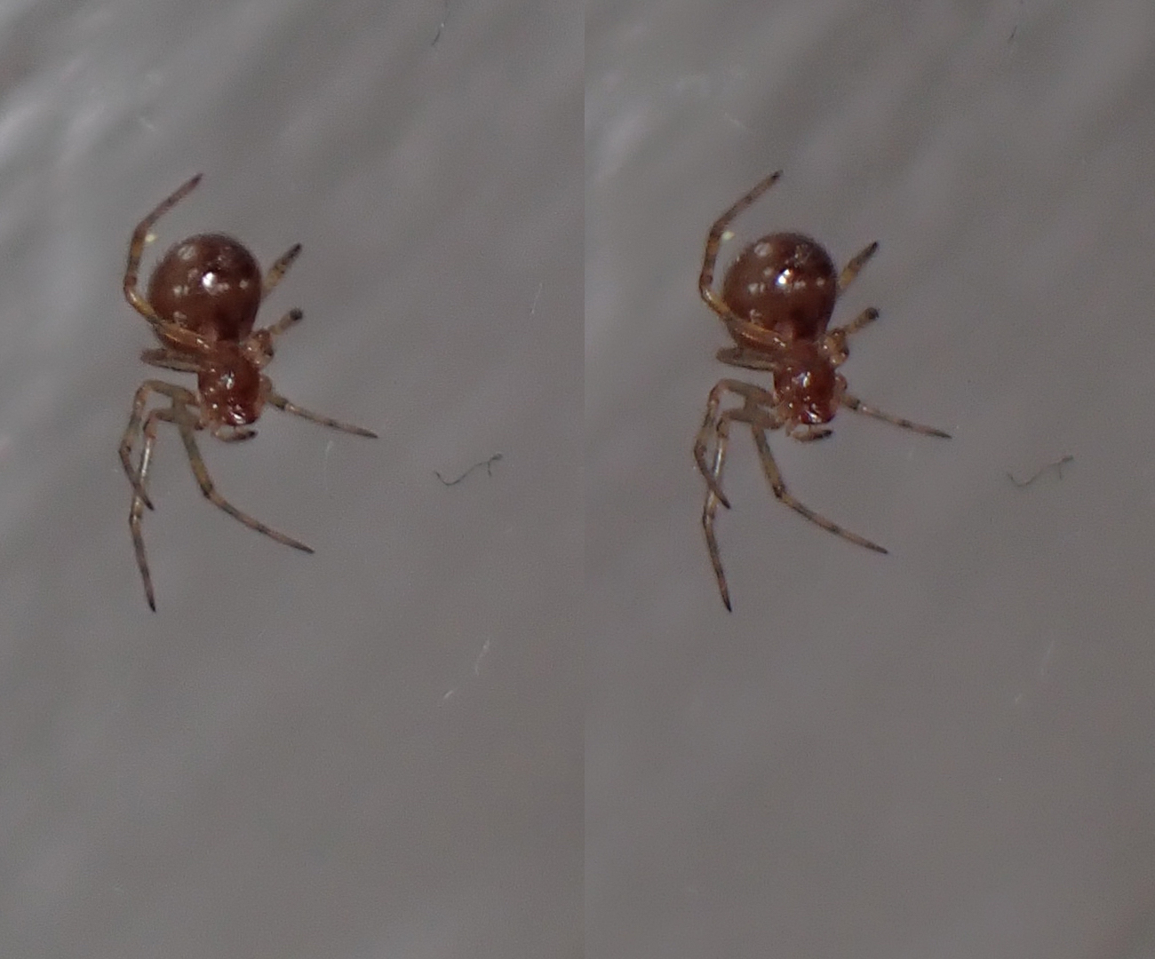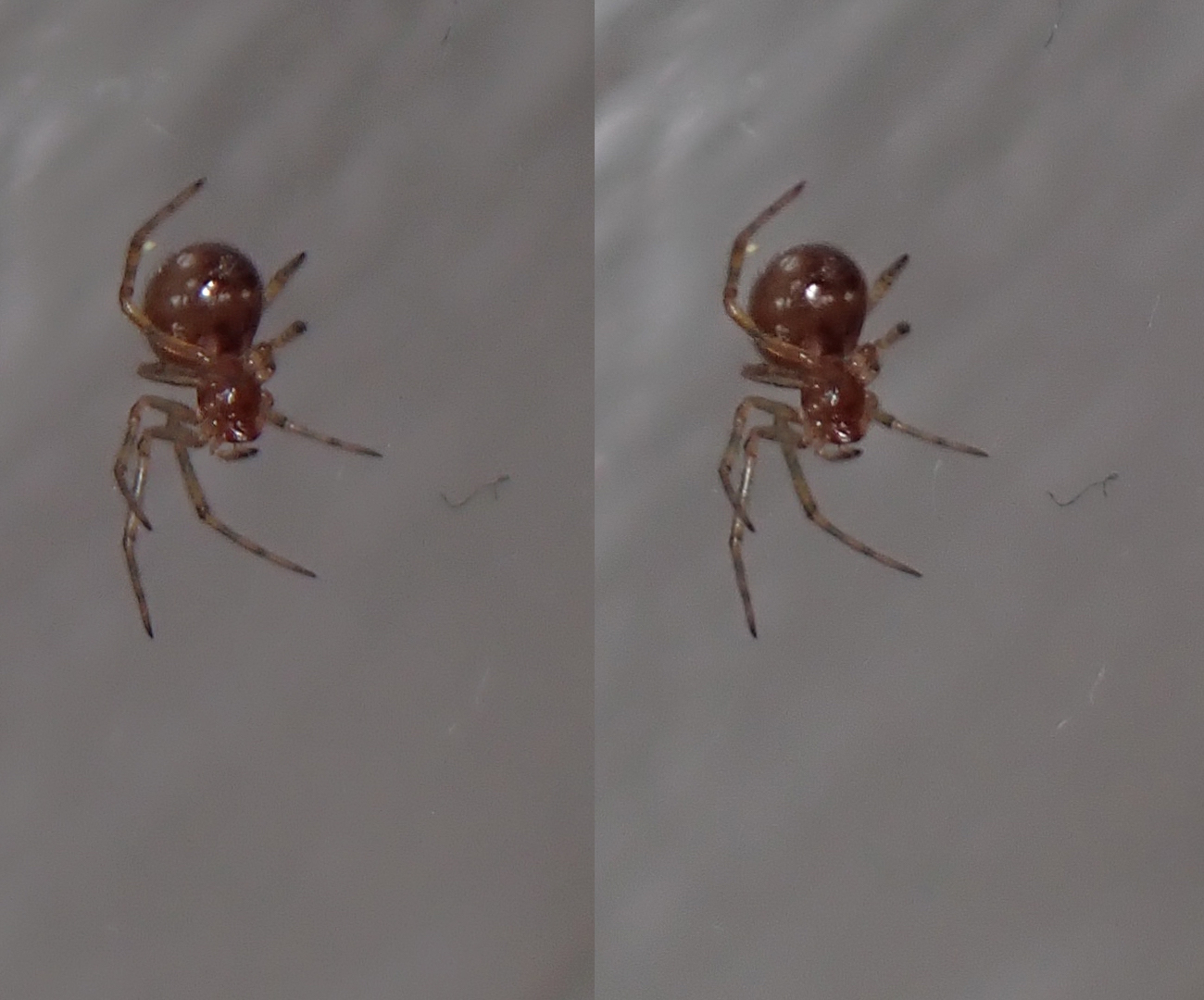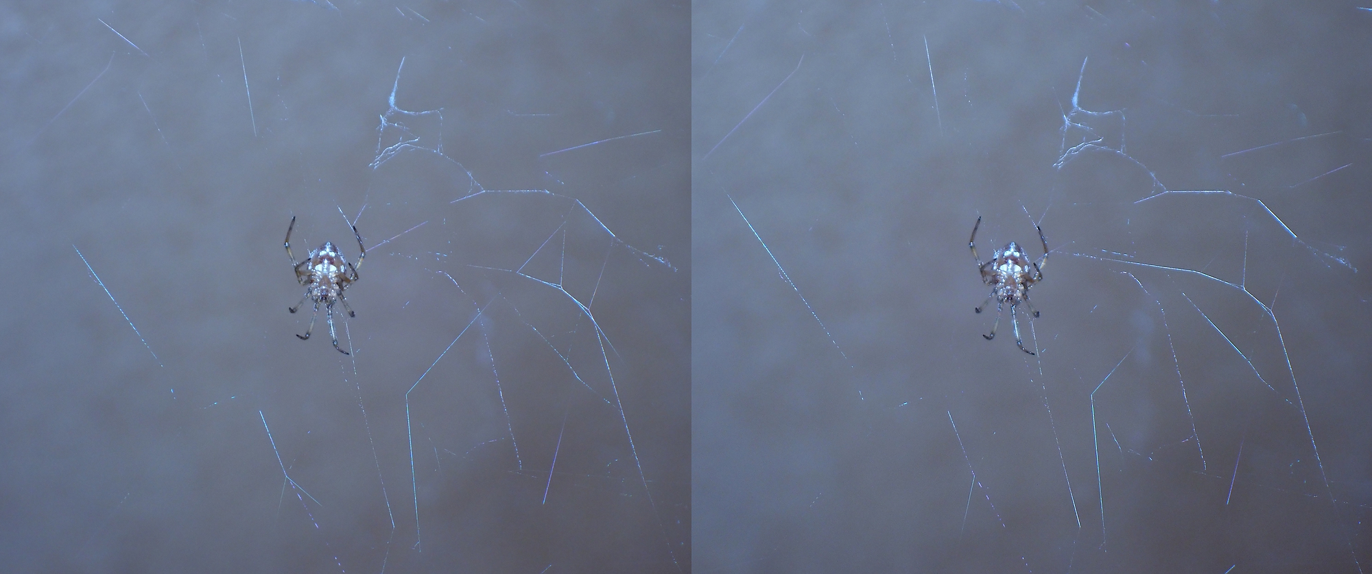Teeny-tiny spiders in 3D macro!—Thanks to getting a flash diffuser to work :) The body of this first paler spider is about 3mm long, and that of the darker one is 2–2.5mm. So even though the details and focus aren’t perfect here, it was pretty ambitious to try to shoot subjects this small, and I’m happy this camera can.