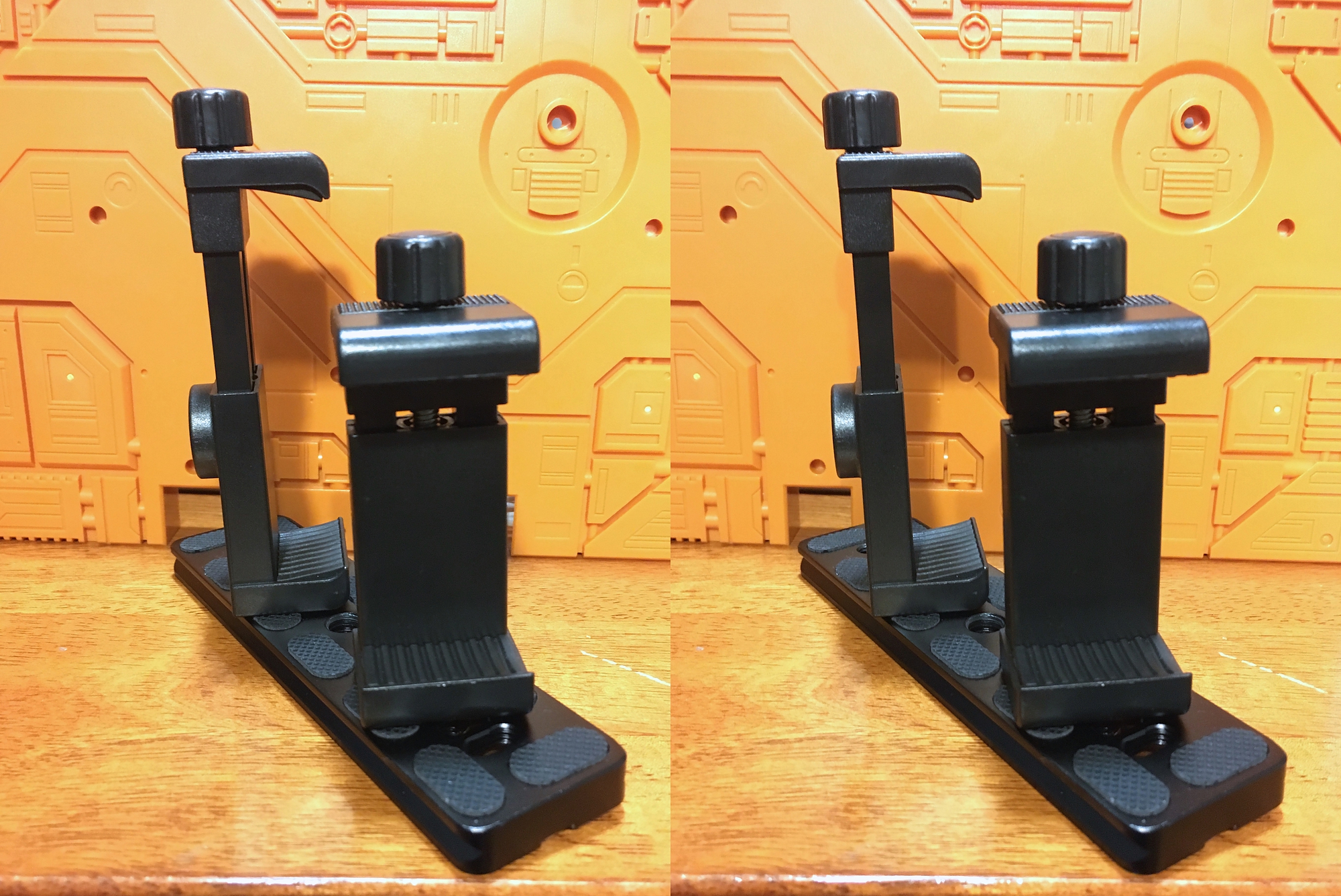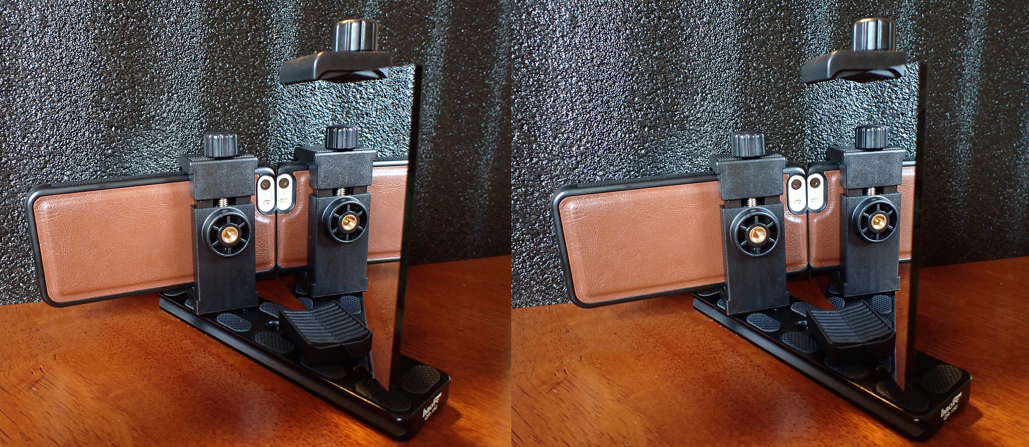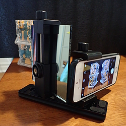 This uses only the clamp portion of the phone holders, which conveniently have their own 1/4" sockets. However, both parts of the holder(s) could be used for added height. The phone and mirror are angled 90º from each other, with the mirror edge very close to the camera lens, as you can see. The mirror-holder pouch in the 4th shot was a thoughtfully commissioned birthday gift I received :)