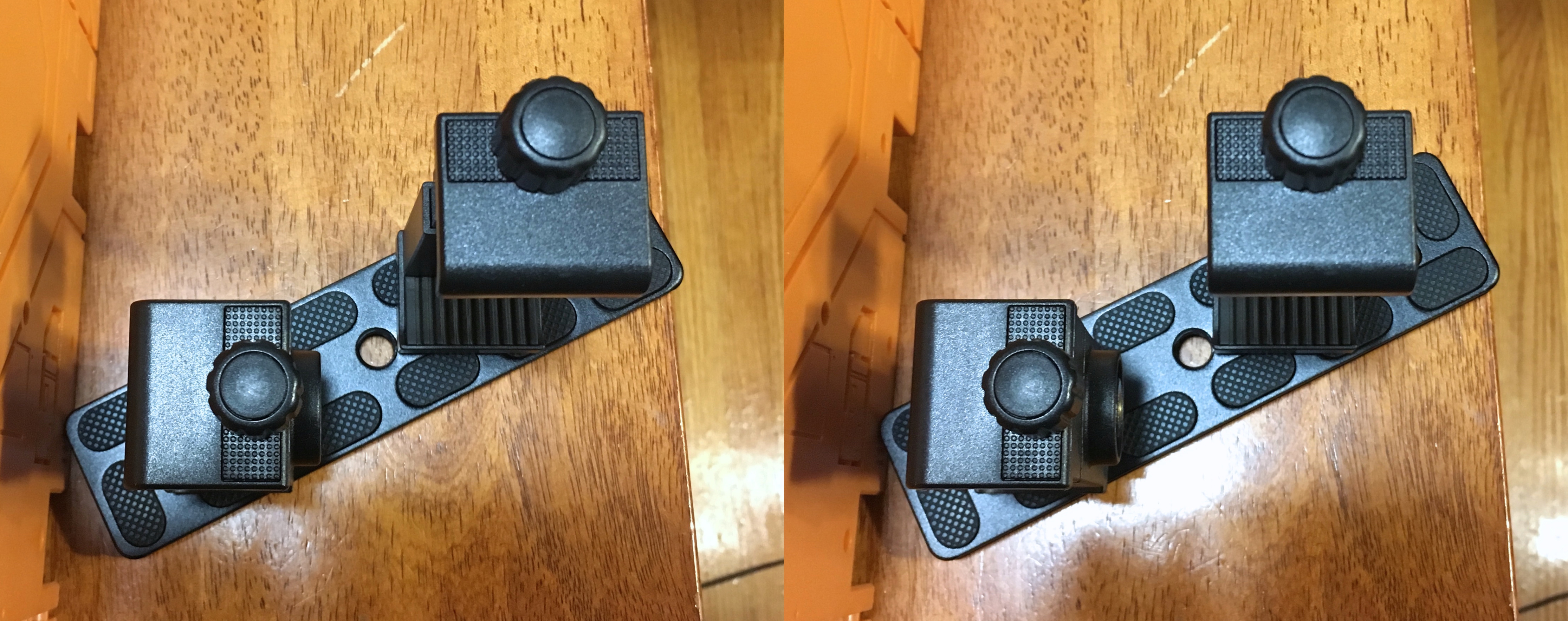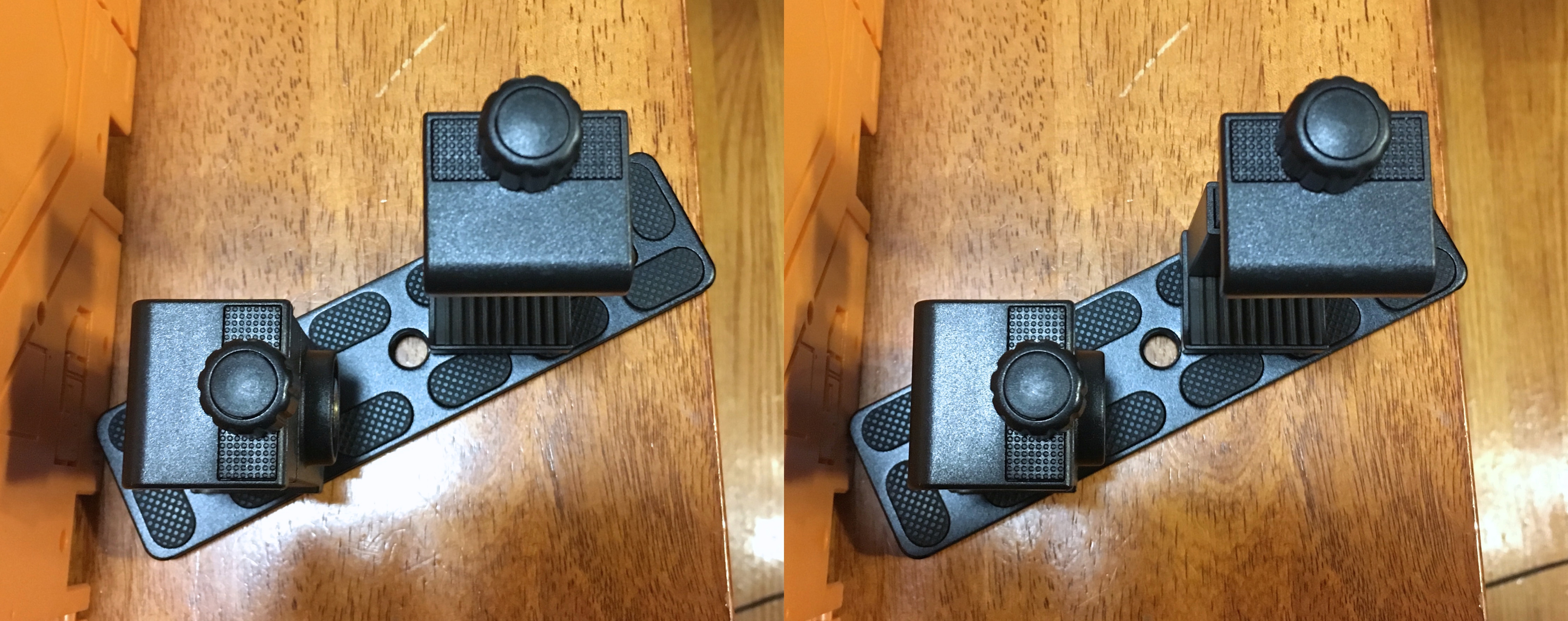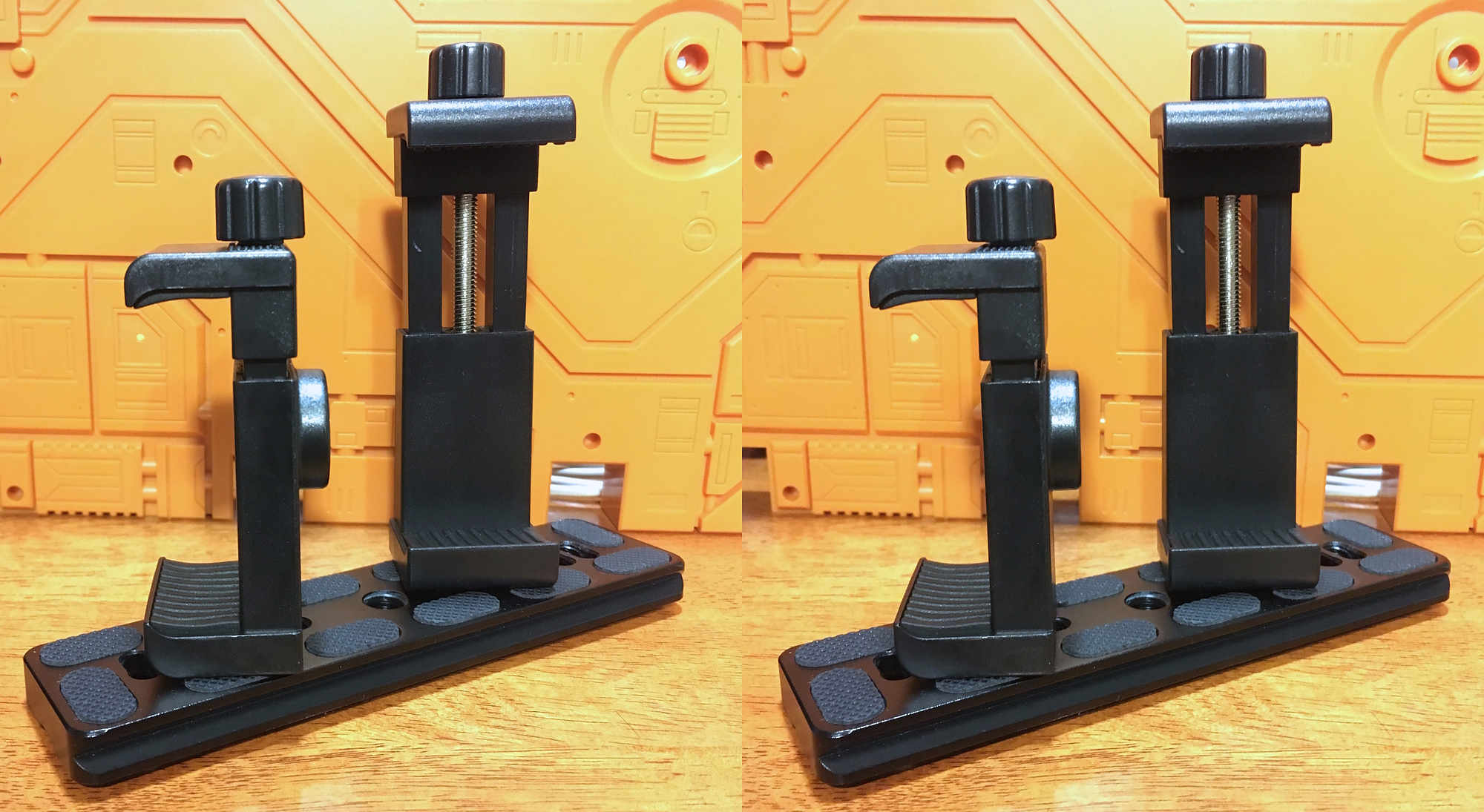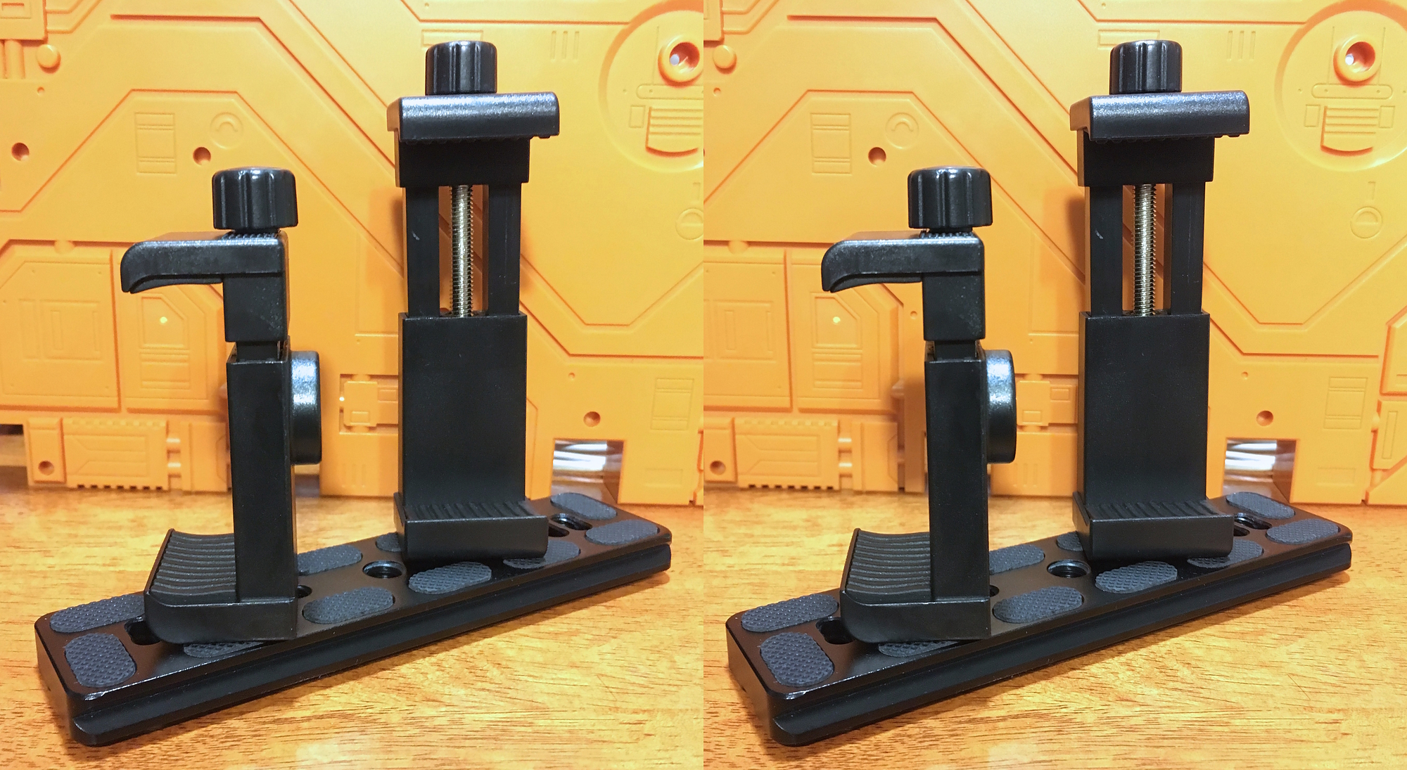 UPDATE: I added more shots without the phone and mirror, for clarity. The taller holder is for the mirror; the shorter is for the phone; note they are angled perpendicular to each other, as can be readily seen from above.