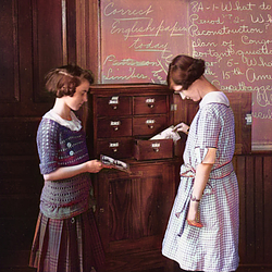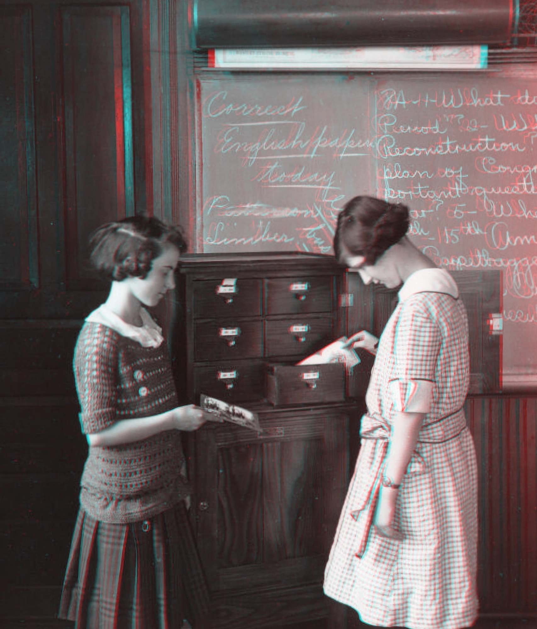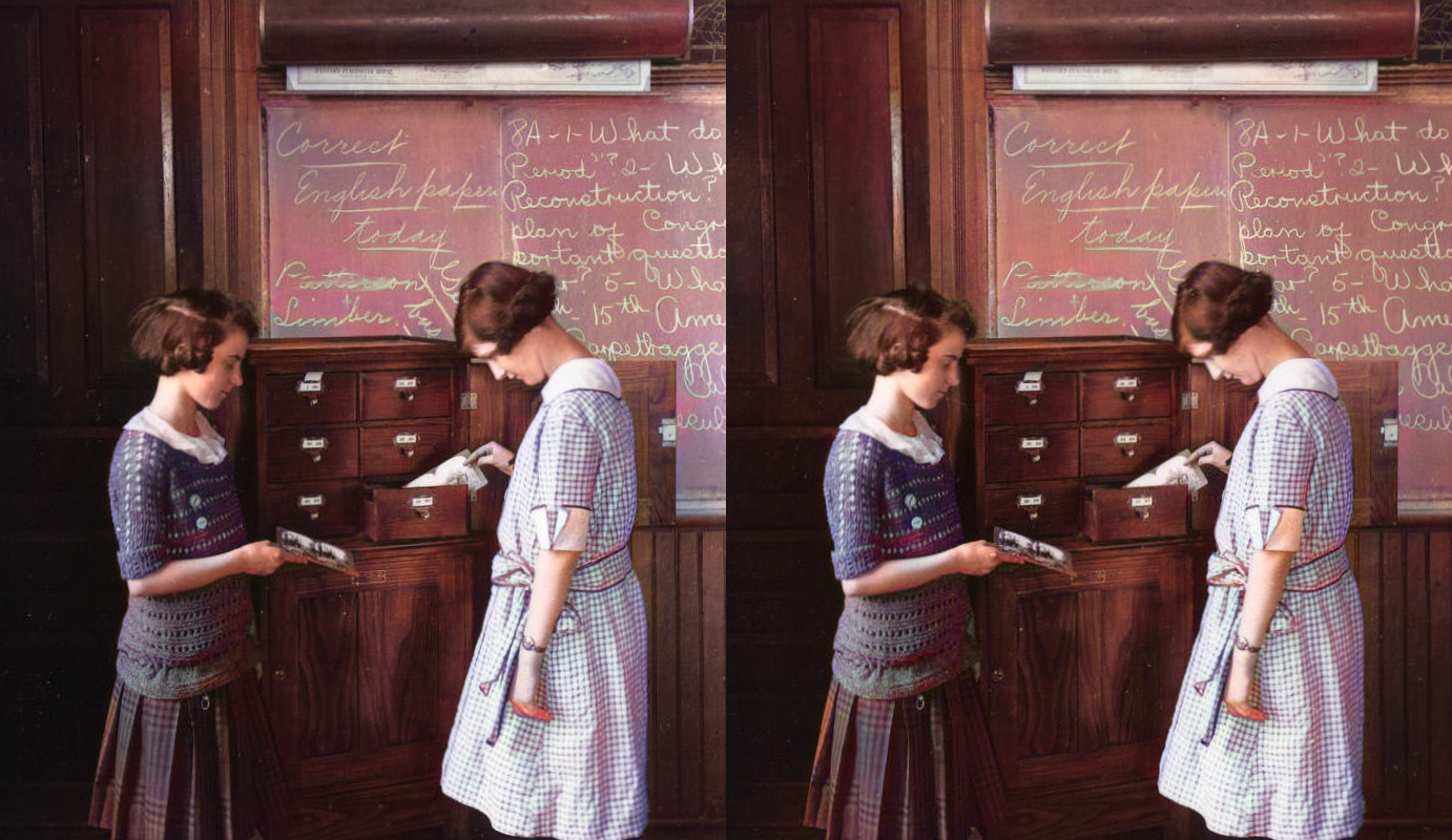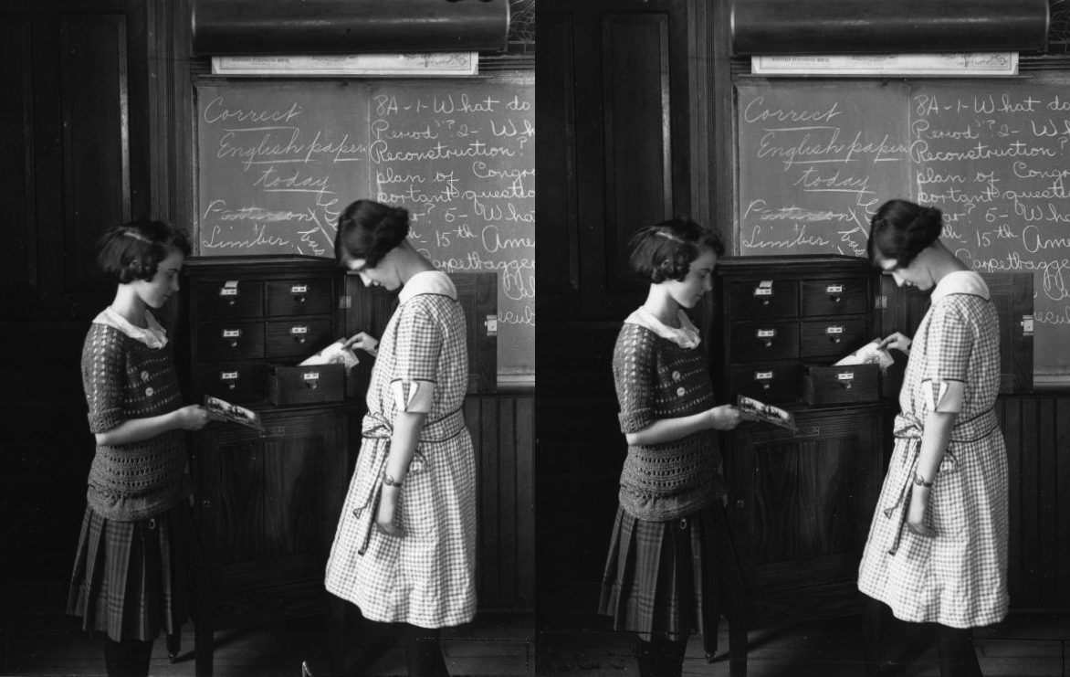 The second image shows the result of running the stereo through the DeepAI Image Colorization AI, which uses machine-learning to guess at colors in black and white images.