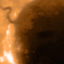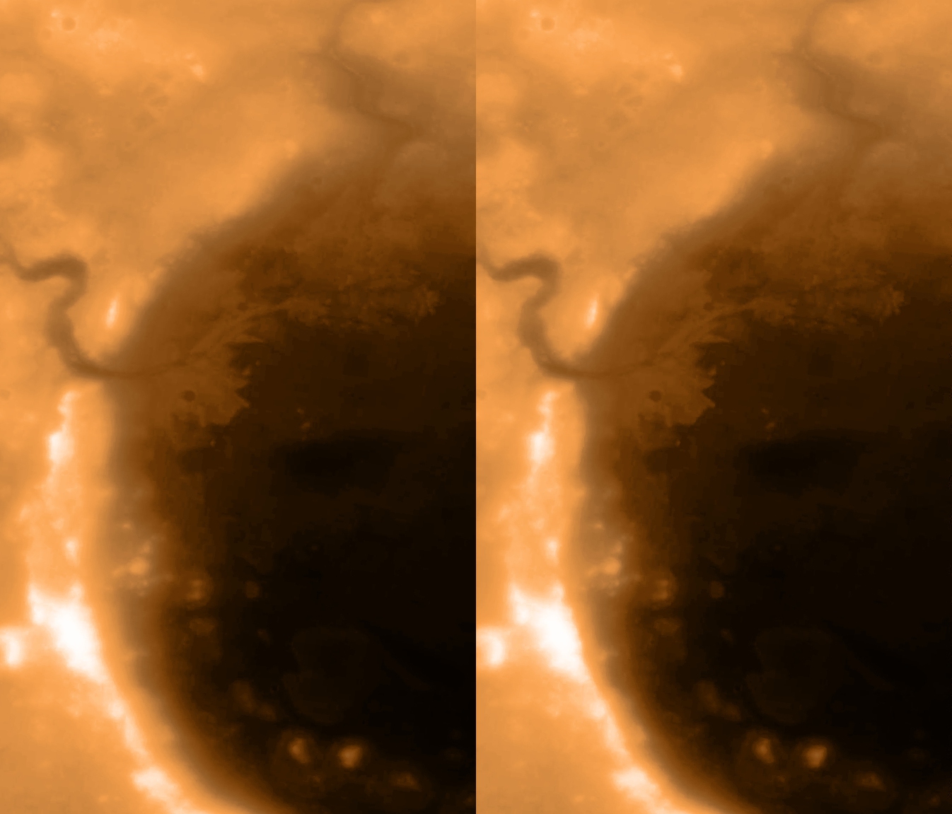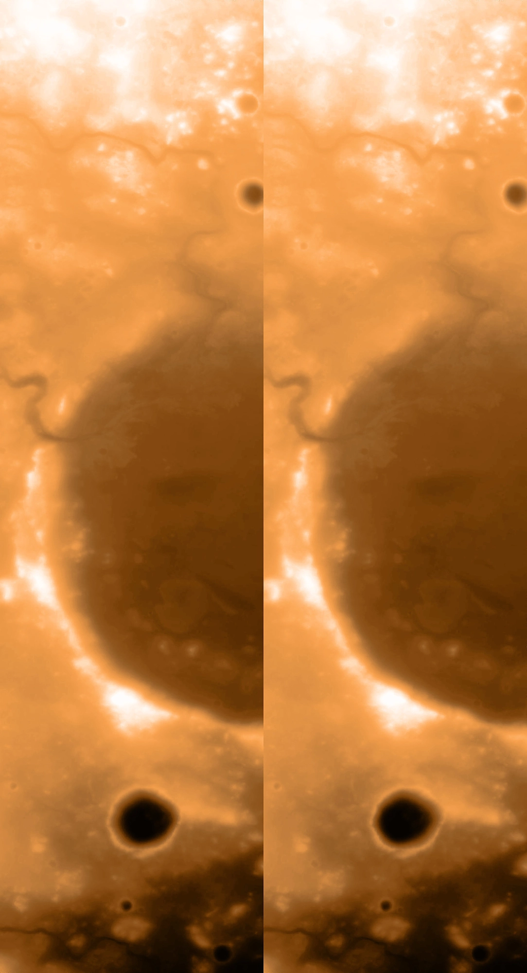 I made these false-color images and videos starting from a digital terrain model (DMT; aka Digital Elevation Map, DEM)—in essence, a depth map—which itself was produced from a pair of images from the Mars Reconnaissance Orbiter’s Context Camera (CTX), and released by Robin L. Ferguson et al. in 2017. So I worked backwards to recreate stereopairs 😁 FYI, for these viewing purposes, the apparent depth is of course exaggerated many times over.