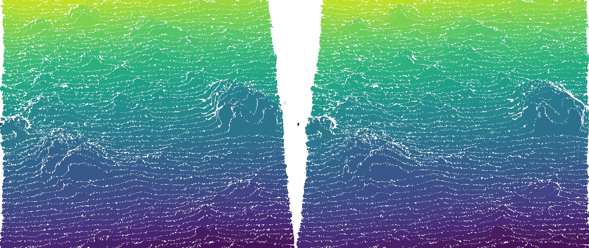 The third is a synthetic curiosity: the occlusion map produced by the SPM/DMAG depth map generation process, combined with the first-pass DPS depth map colorized with the Viridis color palette. It makes a cool 3D terrain map of this scene.