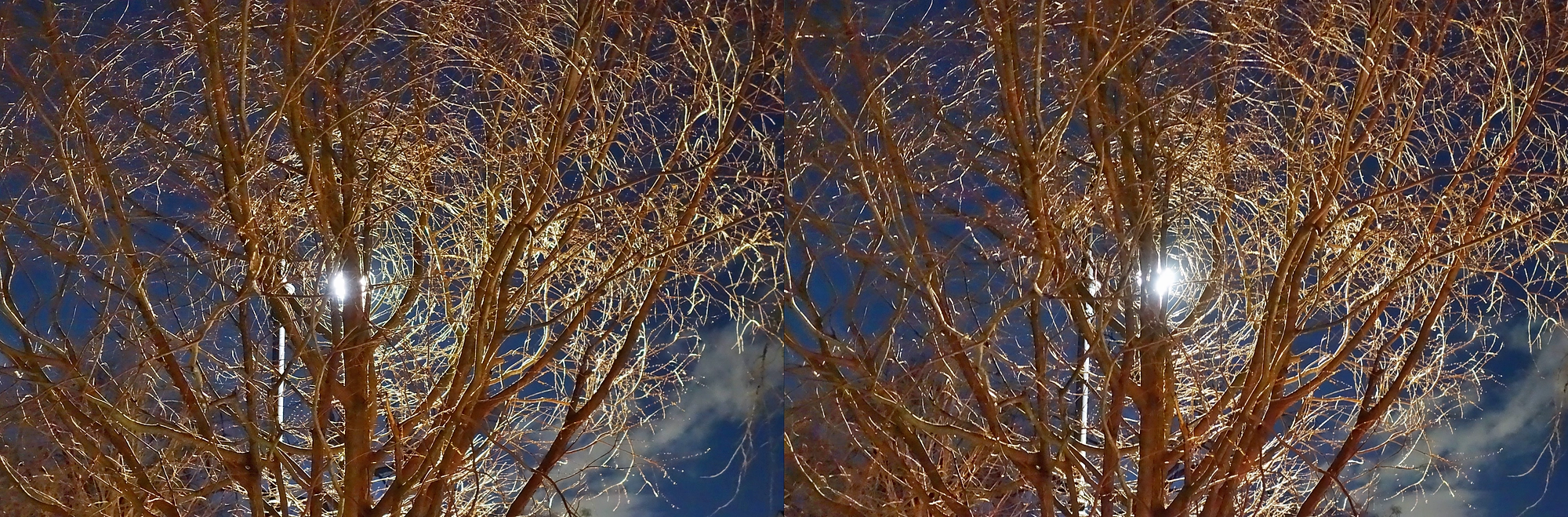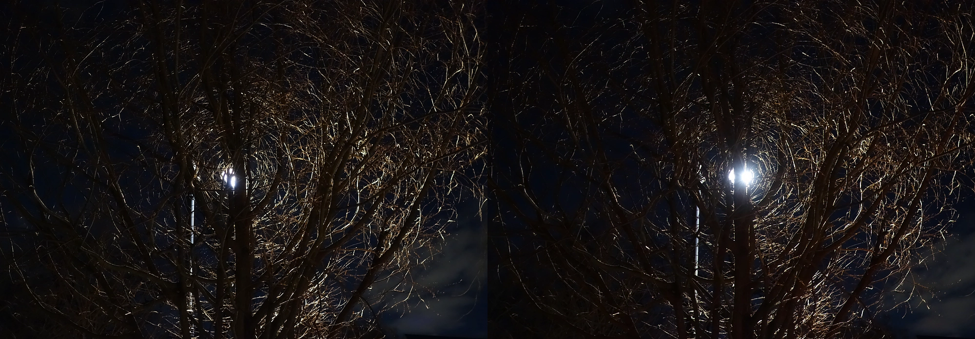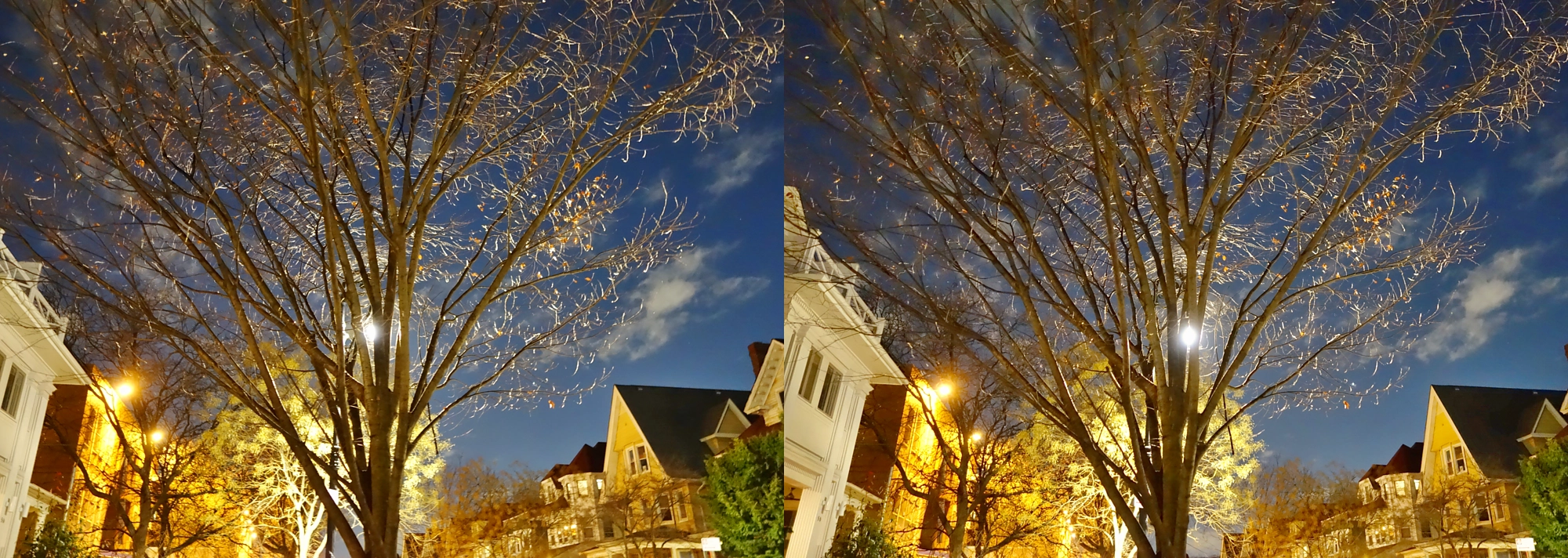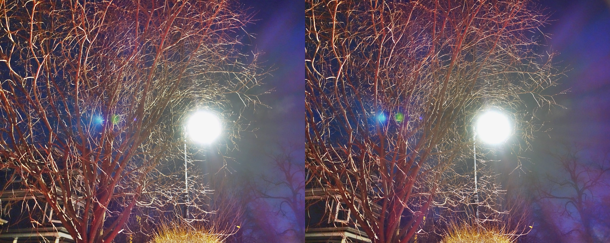 There is a phenomenon I’ve noticed and loved for a long time, that I can only describe as tree branches encircling a light source at night. Basically, when a single light source shines through a tree with very multi-angled branches, it highlights most the branches that run tangent to it, making a pattern suggesting concentric circles. You can see a clear example in this 1st stereo, where the branches—despite NOT have such a curve in reality—appear to curve and bend around the street lamp behind them. This shot uses simulated HDR.
