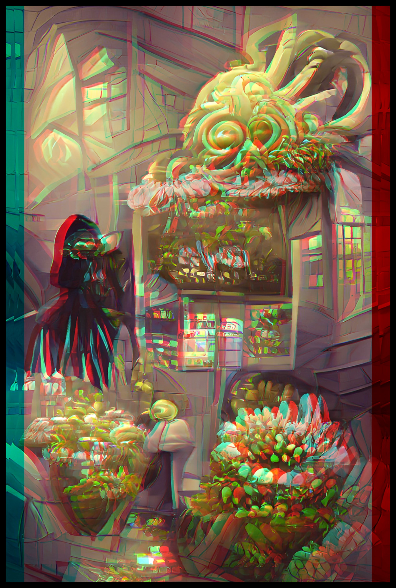 The art was created, 3D-converted, and animated by me, partially using AI. The NFT itself is the first (2D) animation here, but for real 3D views, see the panning and zooming-in stereoanimations, and still stereopairs.