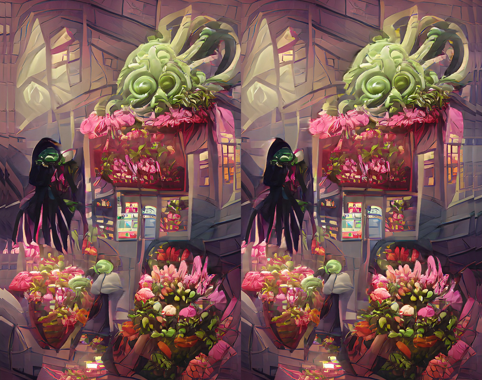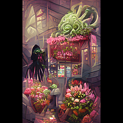 A Cthulhu Valentine’s, part 4: Still some ordinary uncursed flower bouquets available at Cthulhu Florists! Is that Yoda we see picking up a belated gift?