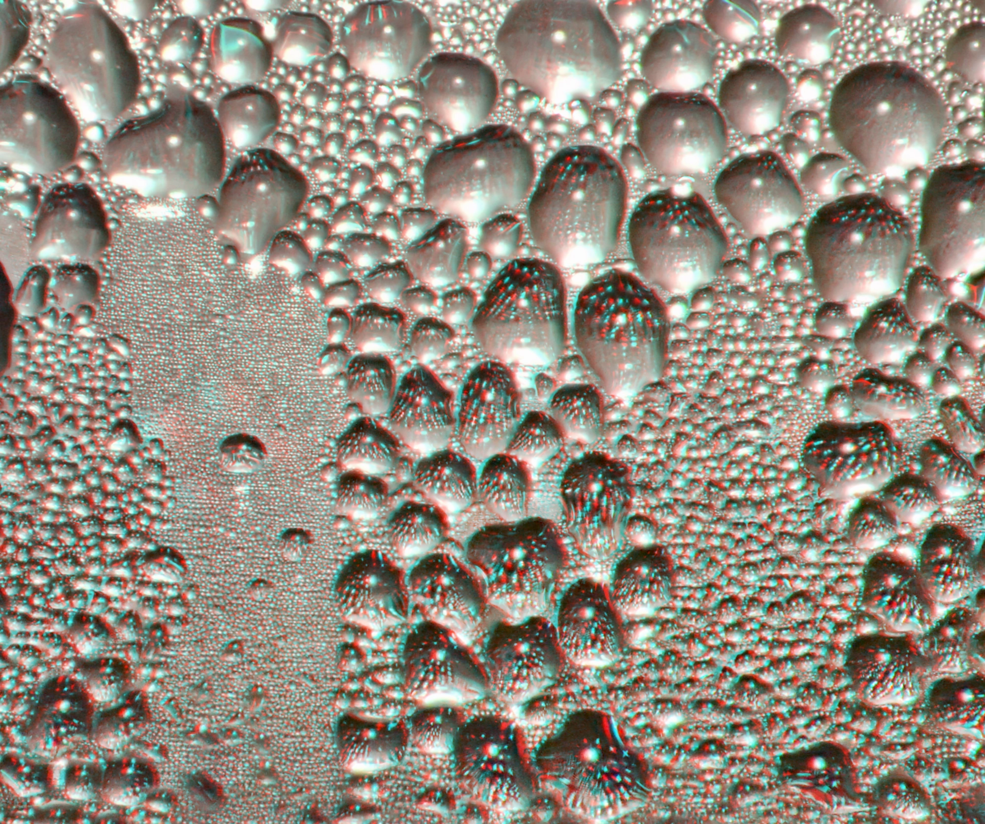 These are close-up macro stereos of condensation on the inside of a windowpane, on a cold day, and presented inverted! I have found that the reason I prefer these inverted is that there’s a weird optical thing going on in the large water droplets. In the inverted versions, do you see those central points of light, that seem to float like tiny suns, above the large recesses, at about screen level? They ‘make sense’ in that 3D placement, floating above the curved surfaces.