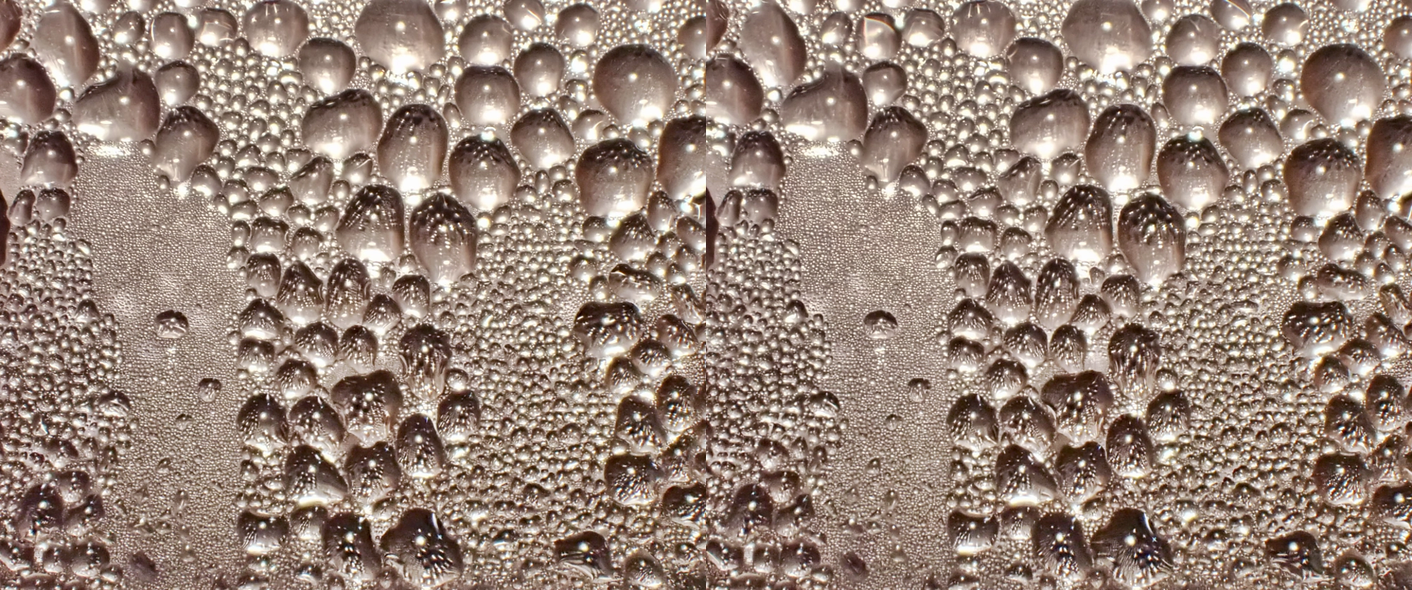 In the 4th shot here, two large droplets had recently slid down the glass, so the smaller droplets in the center regions are newer/younger. You can tell the left valley is newer than the right one based on droplet size.